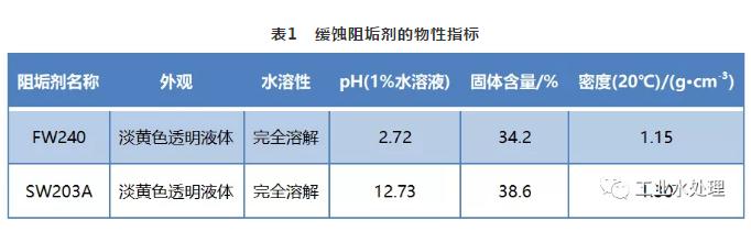 FW240是聚羧酸類酸性阻垢劑,特別適合高pH、高堿度、高硬度的水質。SW203A是以馬來酸酐為原料生產(chǎn)的可生物降解的堿性緩蝕阻垢劑,在海水體系中具有優(yōu)良的阻垢分散作用。FW240和SW203A均為無磷、高效緩蝕阻垢劑,其物性指標見表1。