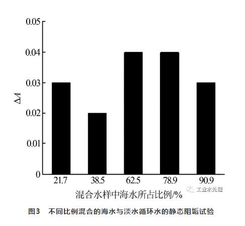 由圖3可知,各種比例混合的水樣試驗后的ΔA在0.02~0.04之間,均小于0.2。表明在海水注入淡水循環(huán)水過程中,海水中投加12 mg/L的緩蝕阻垢劑FW240,可以起到良好的結垢控制作用。