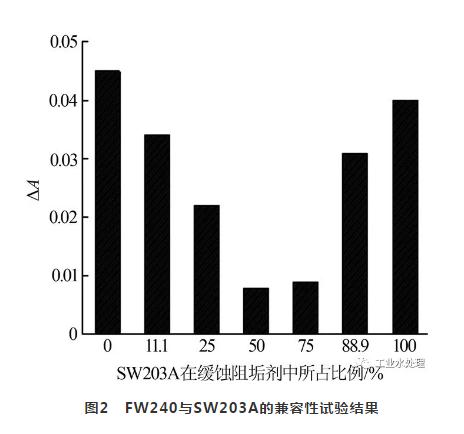 由圖2可知,試驗后水樣的ΔA均小于0.2,FW240和SW203A具有良好的兼容性。