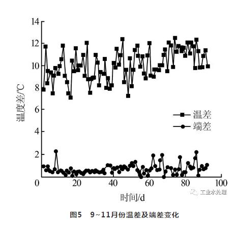 為監(jiān)測淡/海水在線切換過程中系統(tǒng)運行狀況,比較了2#系統(tǒng)9~11月份的每天10點系統(tǒng)循環(huán)水進出口溫差及凝汽器端差,結果見圖5。
