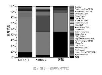 圖2中MBBR-1和MBBR-2為生化池不同區域的懸浮載體,污泥為生化池活性污泥。各部分的主要菌種及相對豐度如表4所示。